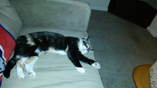 It was less than a week that I opened the bedroom door to let her roam freely. And that is just what she did. She would go use the living room litter box more than the bedroom one. She loves to sit in the living room window all day while I work. Or just curl up and sleep on one of the dining room chairs. And when I’m on the couch watching TV she’ll jump up there with me: