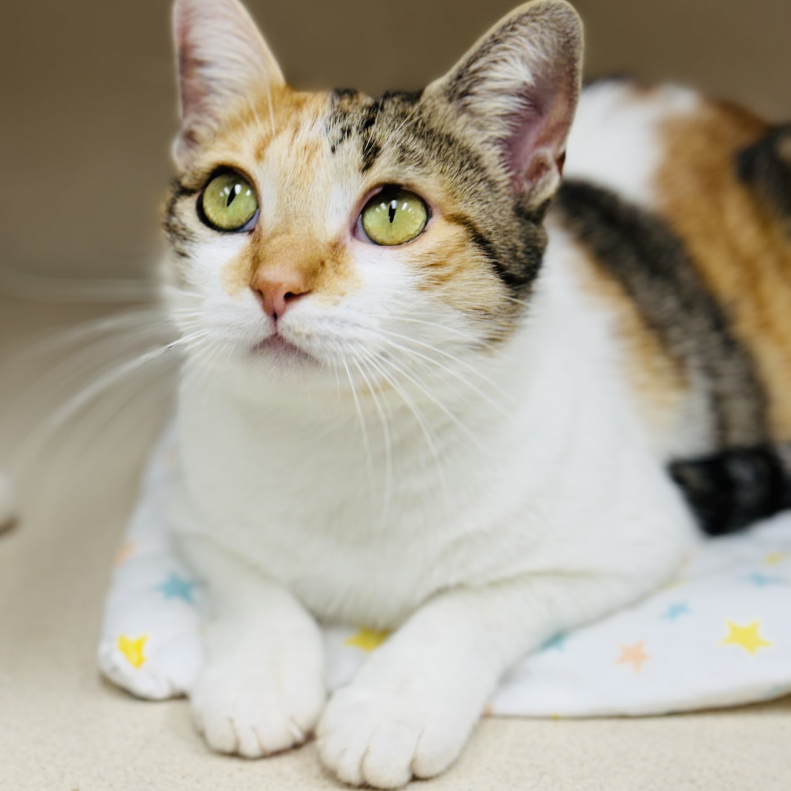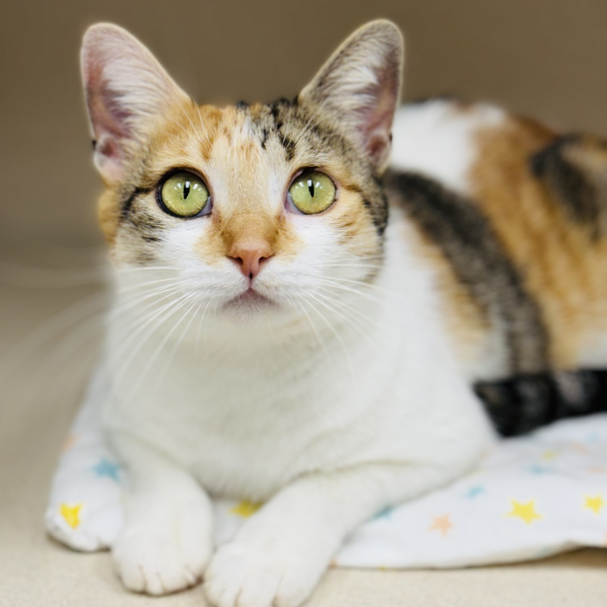 Calico cats are all too frequently named Callie, and while we think it is a cute name, it is far too common for an uncommon beauty like out Callie (aged 1). Because Callie is a stunner. From her celadon green eyes (with perfect eyeliner), to her pink nose to her burnt sienna, cream and butterscotch fur, to her milk-white paws, this girl is absolutely lovely. Stop and stare lovely. Need to touch lovely.