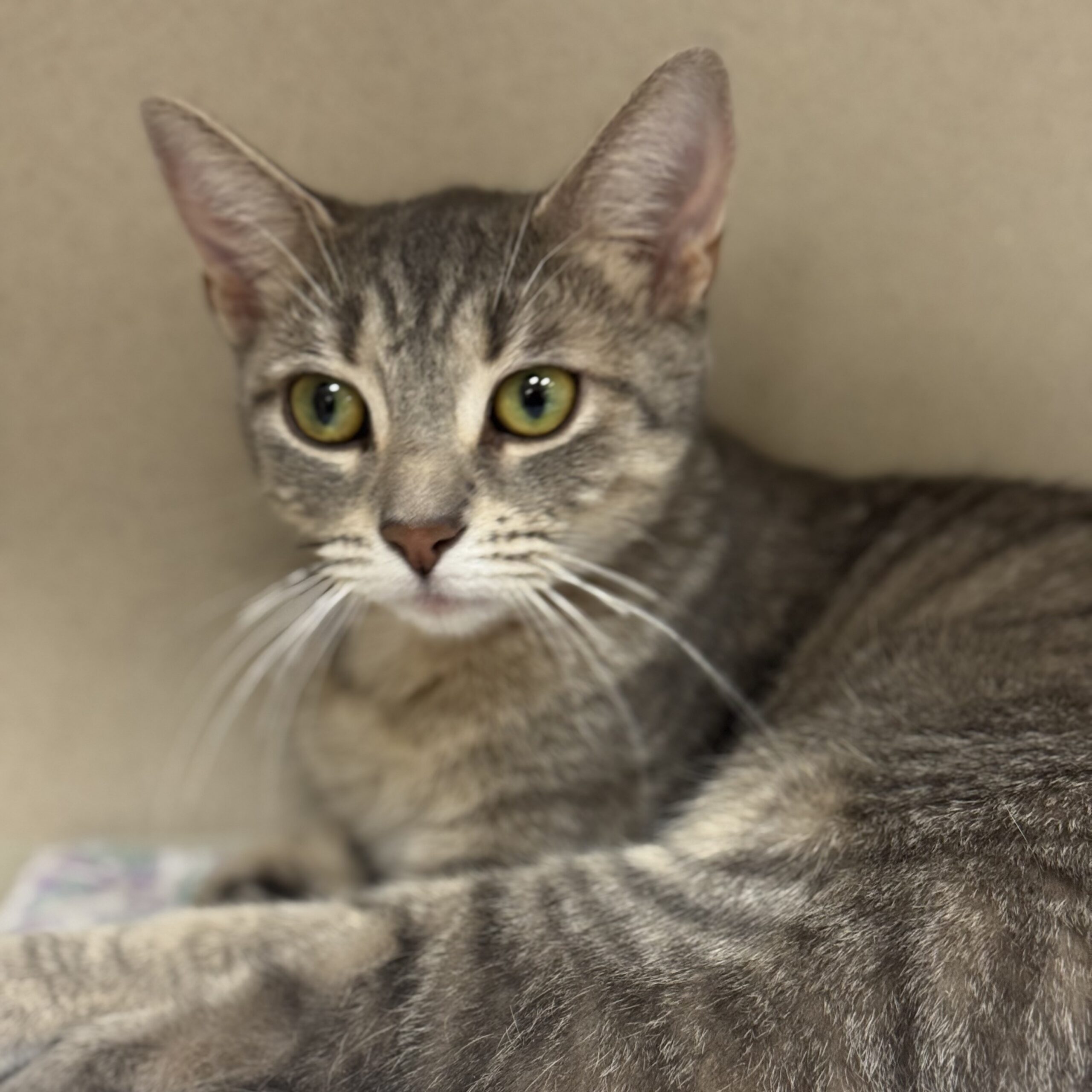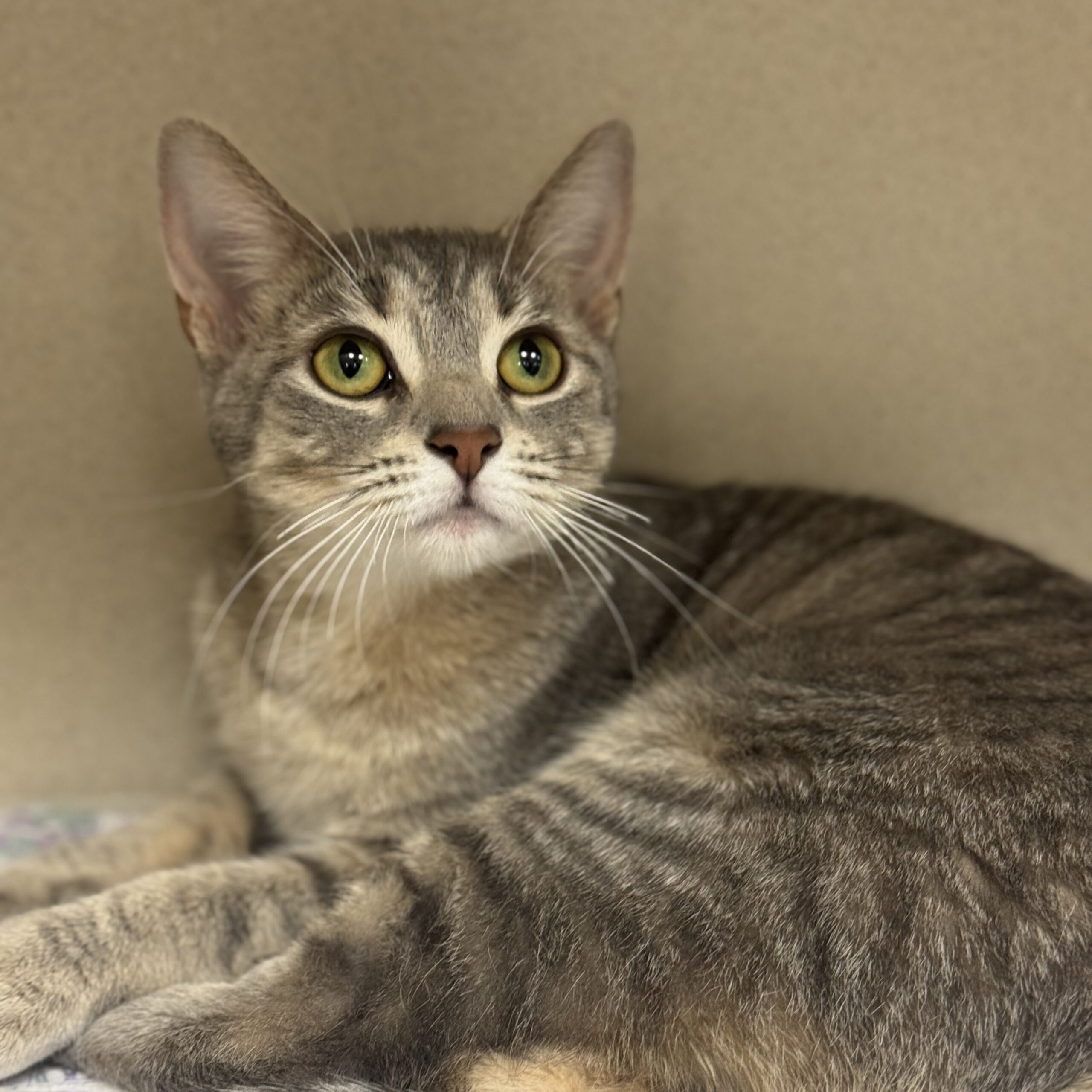 Two-year-old Dolly is a lovely lady who had to grow up faster than she might have liked. She's already been a mama to 4 kittens but still holds tight to her playful energy, as though she wished she were a kitten herself. Dolly loves active entertainment and is happy to spend time with people who indulge her interest in stalking, jumping, leaping and twirling. She's very grateful when she finds a human playmate though Dolly's energy level isn't always elevated. She's not one of those battery operated toys that refuses to shut itself off. There are periods of rest and repose between her gymnastic sessions, and during those times she is happy to be cuddled or even held.