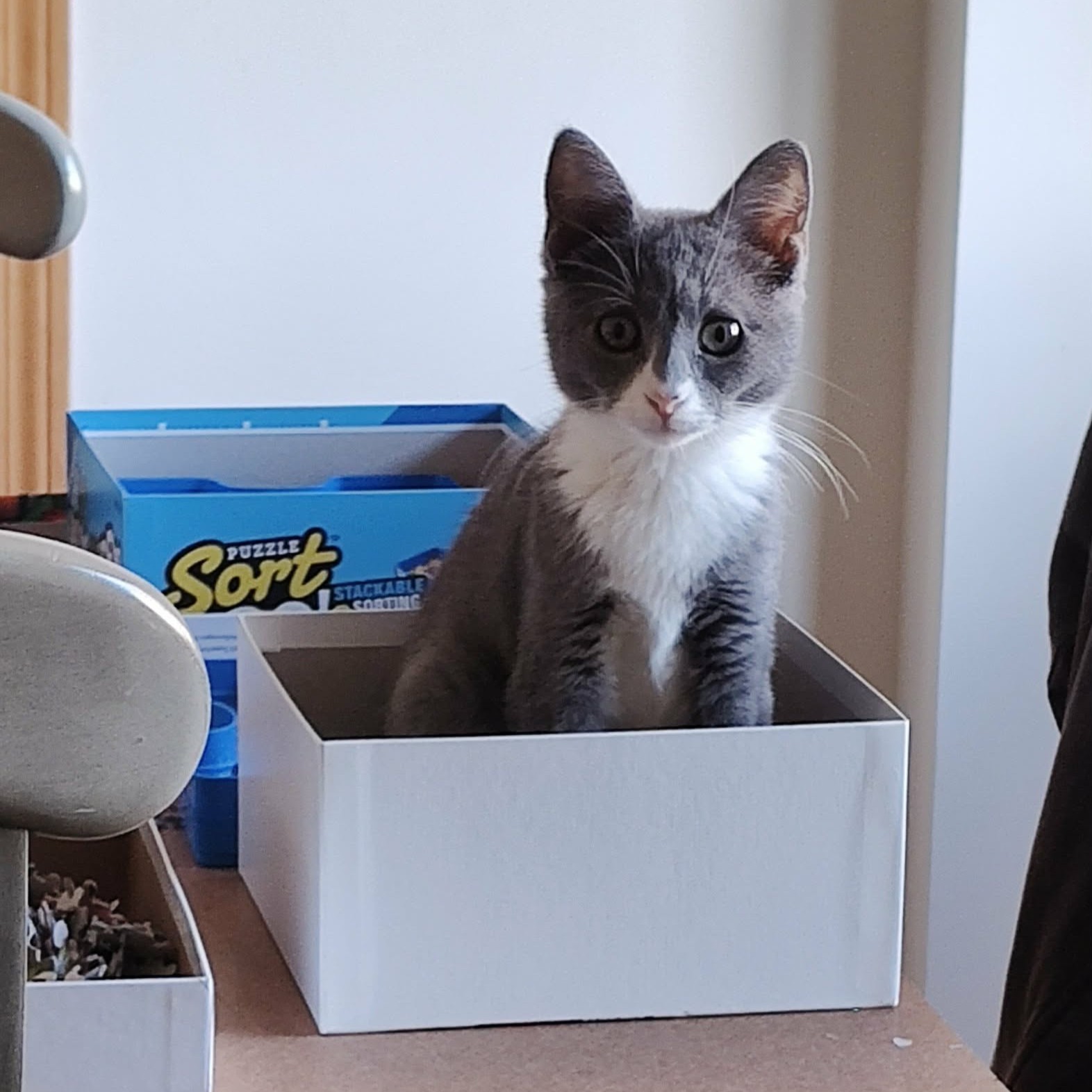 Ellie is the sweetest of kittens. She is outgoing and has loved everyone that she has met so far. Even after a short time of knowing you she will be your best friend and follow you all around the house. She is quite the social butterfly and enjoys interacting with the people and other cats in her foster home. She is still a bit skeptical of the dog but is brave and will approach the dog for a quick hello. She is an adventurous girl and loves to sit at the highest level of the cat tree. She has also been learning a lot in her foster home, like how to drink from a water fountain and how to birdwatch. She loves to snuggle and has begun sleeping in bed with her favorite people. Ellie is so easy going and would make a great addition to any home, but would appreciate a furry friend to play with and a human to cuddle up to.