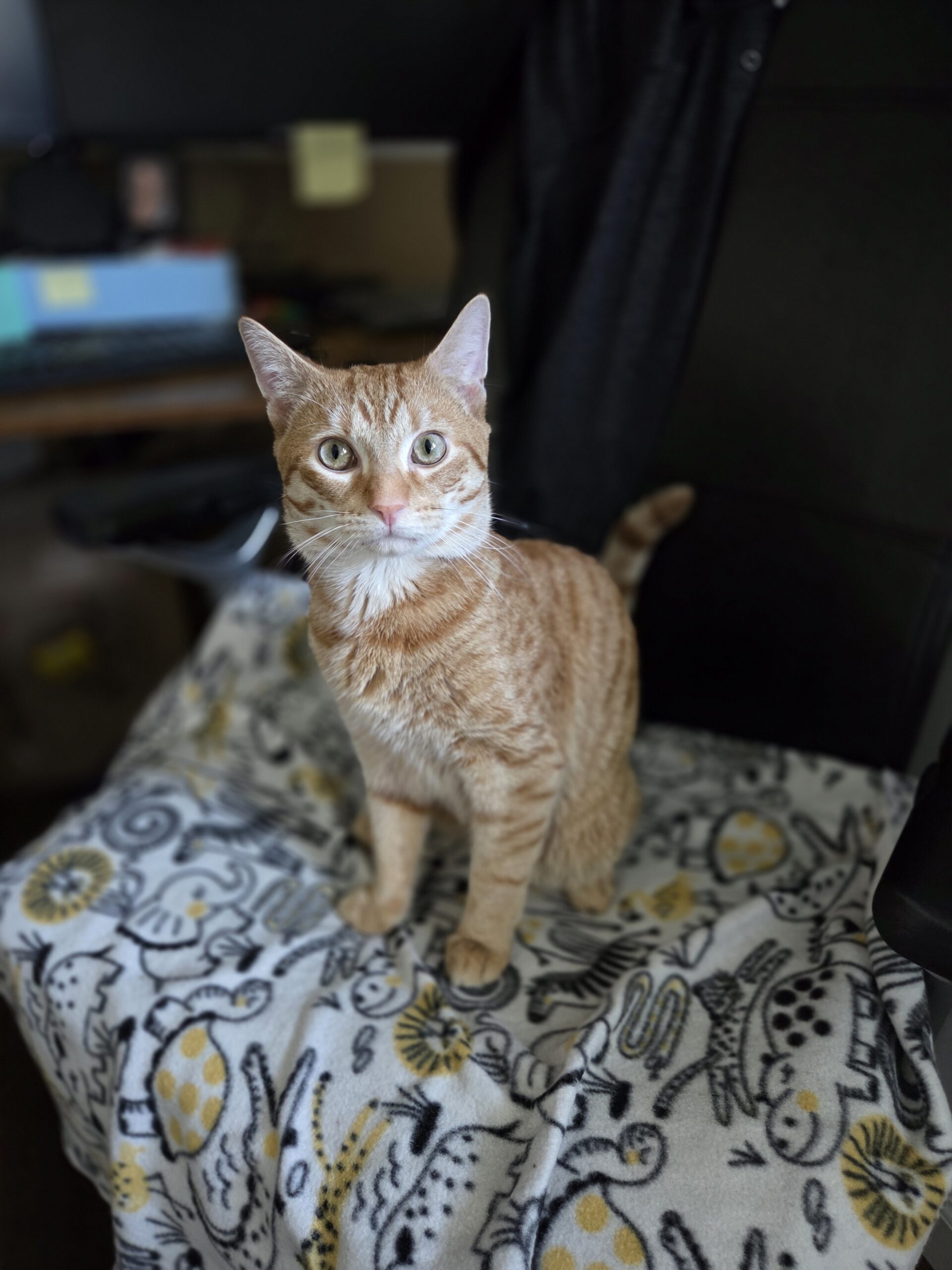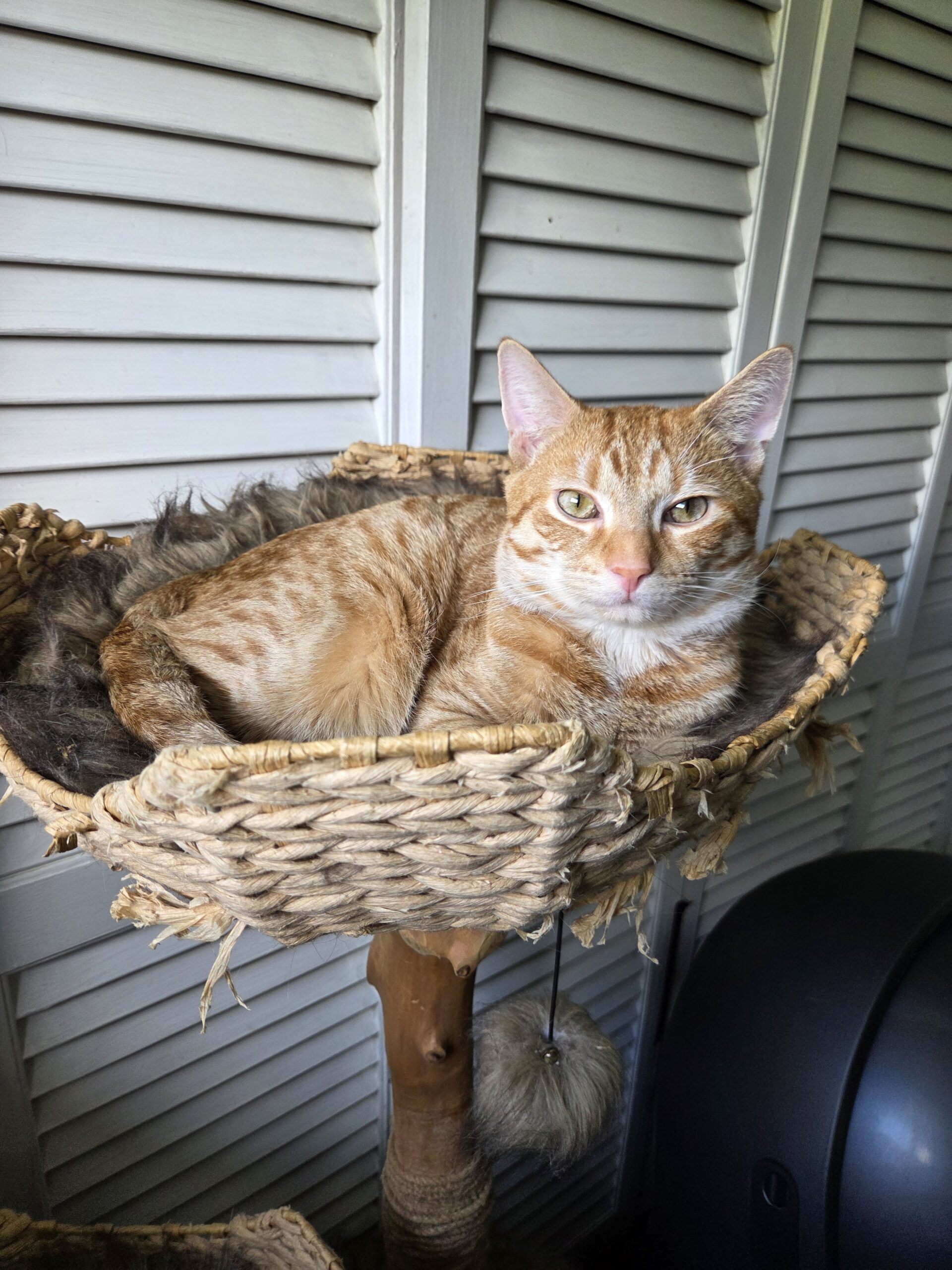 Miles thrives on interaction and would love a home where he’s encouraged to play, explore, and be his cheerful self. Stock up on wand toys (feathers preferred — he insists) and he’ll happily demonstrate his impressive agility. In return, you’ll be rewarded with impeccable litter box manners, a hearty appetite, and enthusiastic gratitude in the form of chirps, head bumps, and hopeful stares whenever treats are involved.
