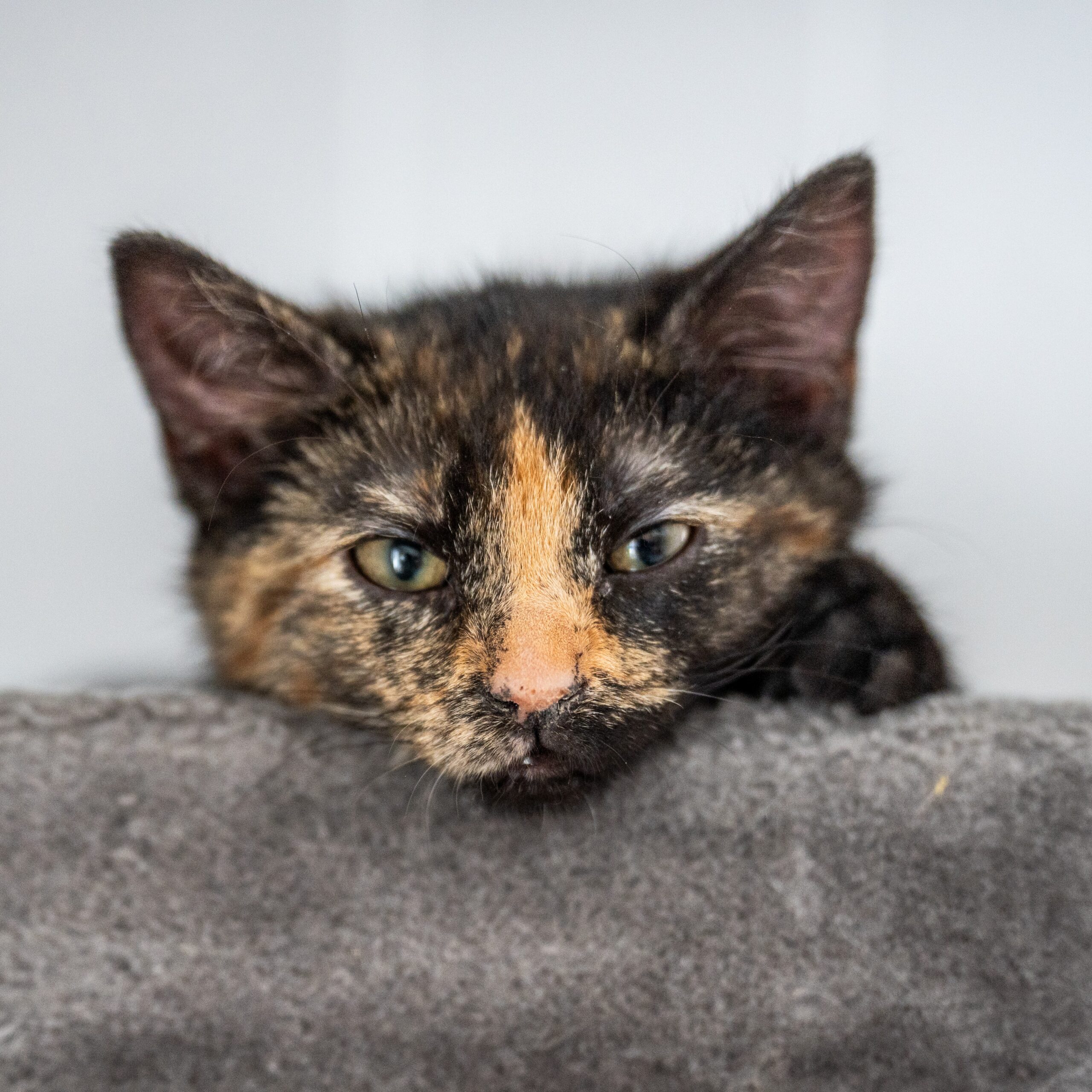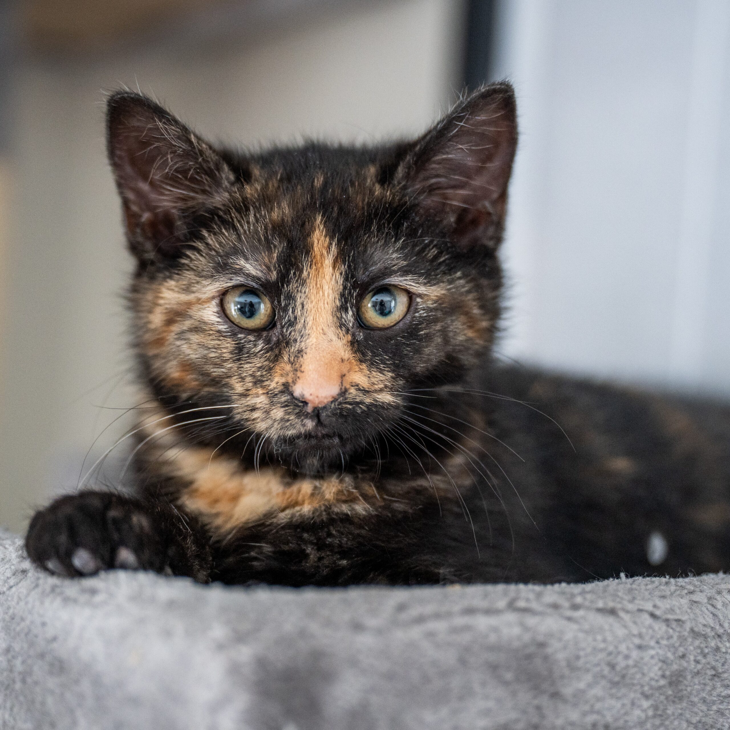 Four-month-old Nyx is a sweet but cautious girl who is learning to open her heart to people.  She originally came into her foster home terrified and untrusting of humans.  Instead of just hiding she would hiss at people to protect herself and her litter mates.  After spending more time with people she finally came to the conclusion that they were not in fact going to eat her or her siblings and she started to relax.  In fact Nyx realized she loves playing with wand toys and will crawl right into a lap for a squeeze up treat.  Nyx will also tell you she’s ready to play by walking over to her favorite toy to sit by it and make eye contact with you.  She’s learning pets are really great and will purr and close her eyes when receiving them.  She’s even curled up in a lap for it!  Nyx loves her siblings dearly and would like to go home with one of them.  (Check out Orion and Peanut Butter Monkey!) Once she decides you can be trusted Nyx will love you deeply and show her truly sweet side.