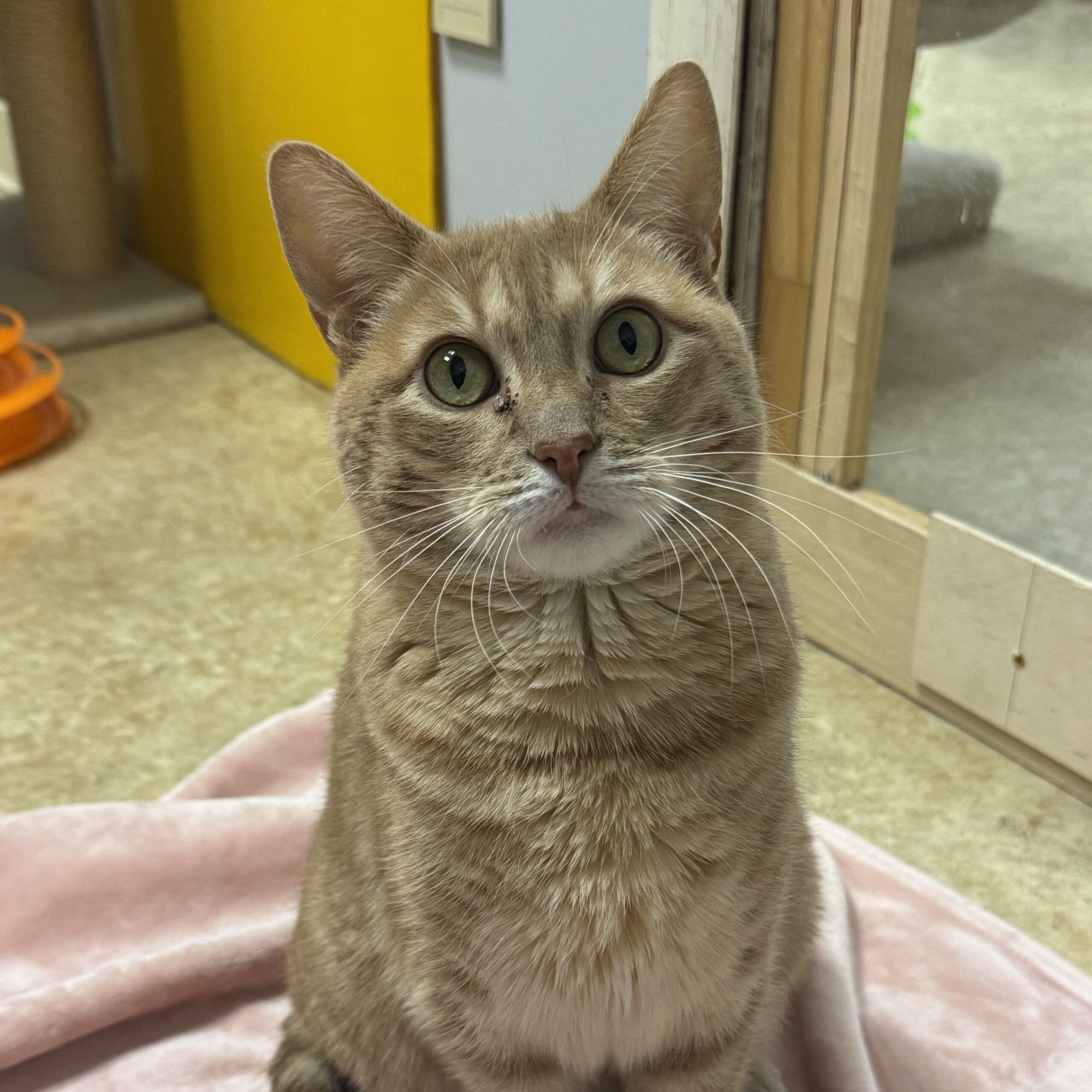 Stevie Nicks came to Protectors of Animals back in 2022 when she was an older kitten. She was surrendered because her people had too many cats. Perhaps because of the number of cats, Stevie had limited involvement with or trust in people. While in her condo, she hissed and spit and flinched away from us.