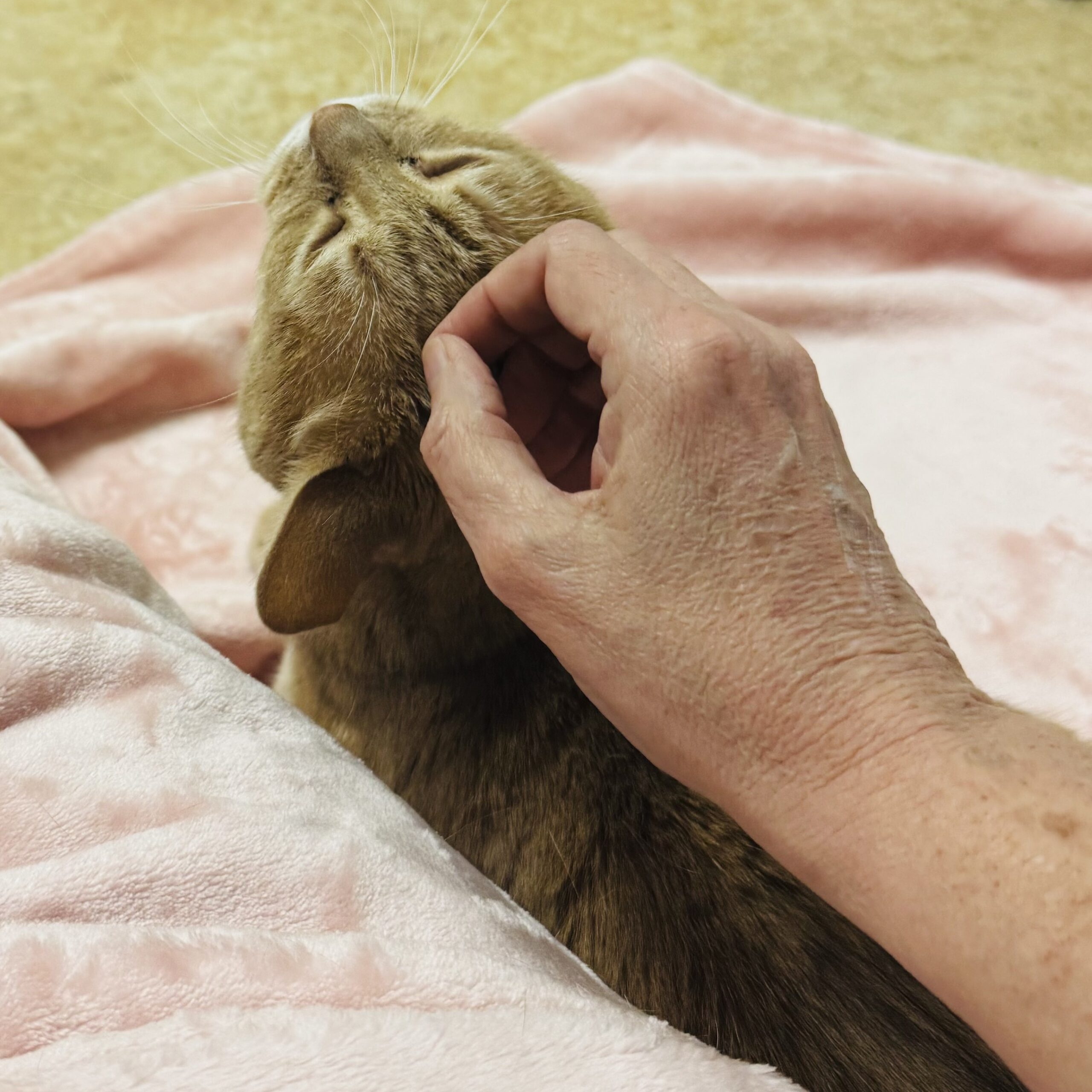 And then one day she escaped from her condo. She hid at first. But then she approached us. She sought petting. She curled up next to volunteers. It turned out that Stevie wasn’t afraid of people- she was afraid of confinement. We had never heard of a cat with claustrophobia, but we didn’t know all of the details of her history. Maybe she had been confined for too long in a small space. Maybe she had been held too tightly. Whatever the reason, she let us know what scared her and we worked with that. We did not try to pick her up. We did not try to put her in her condo overnight. We gave her food and water on the floor where she felt safe. We let her approach us for affection and freely gave it when she did. Stevie blossomed.