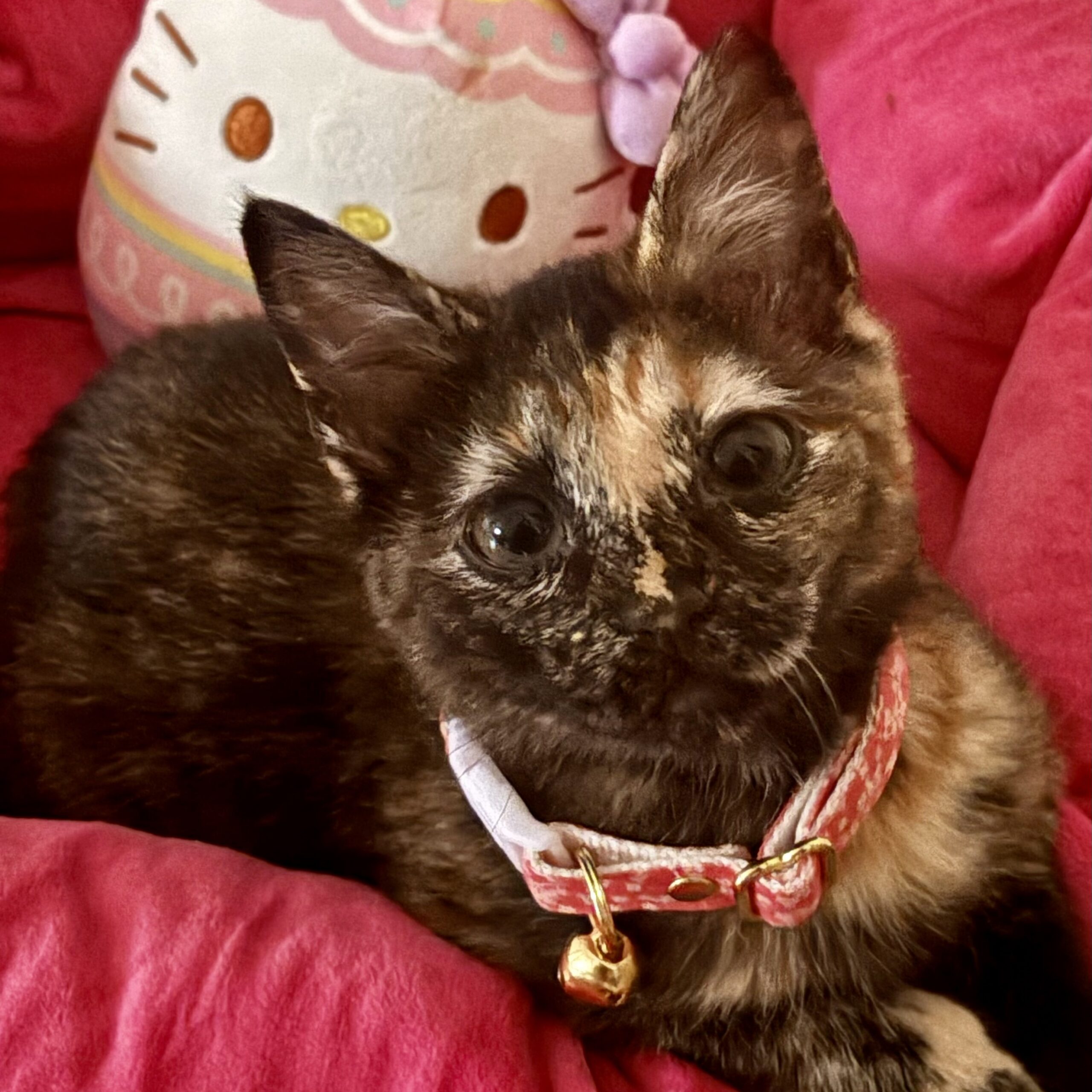 What a little spitfire! Sundance is the most beautiful girl both inside and out. She may appear shy at the shelter but in a home she is playful and loving. She loves to lie in her foster mom’s lap and have her head and face rubbed and in return will give sweet little kitty kisses. She was fostered with resident adult cats and got along well with all of them. She was also fostered with a large gentle dog. Initially she was wary of the dog though with time has become more accepting but she might not be a fan of a feisty dog. Favorite toy - ALL OF THEM. Sundance has never met a toy she didn’t like. Wands, springs, balls with bells, crinkle balls, tunnels, ball chases - she is a feisty girl with her toys. Favorite treat -ALL Of THEM. Sundance loves both Churus and Temptations and will steal them from her brothers if she gets a chance. This little love bug has so much to give and will do well in any loving home.