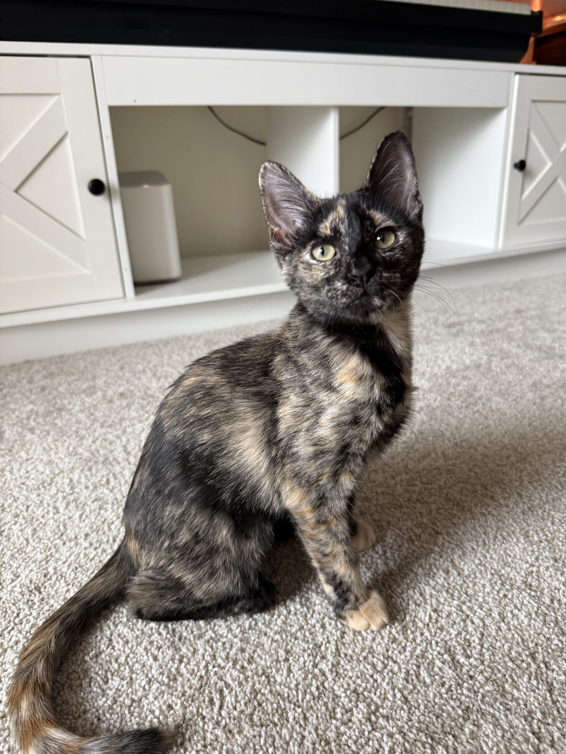 Toffee is a very affectionate cat. She can be shy at first with new people, but once she gets to know you, she snuggles right up. Toffee loves to wrestle her siblings and carry her toys around in her mouth like a prize. But she is not afraid to stand her ground if the playing with her sibling gets too rough. She also loves to cuddle with her human during a nap. She is adventurous and curious to explore around.