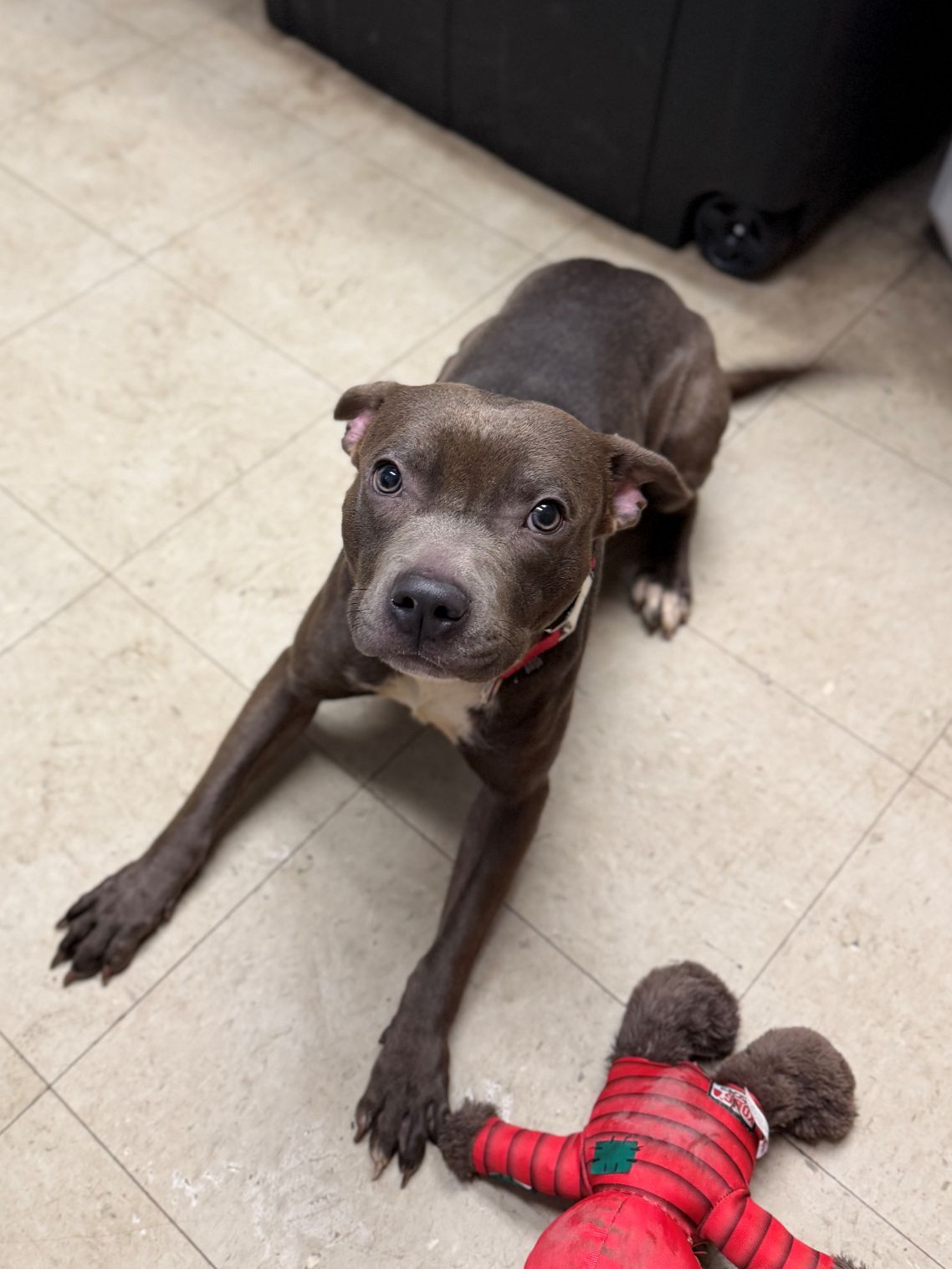 Hi! My name is Dustin and I’m new here! Some nice humans found me wandering outside and I’m glad they did because it was really cold. I’m a 1 year old male Pitbull mix and am smaller than all the other dogs here, but that’s okay because I’m still a growing boy. (Everyone keeps talking about my ears … are they too big for me?) They think I’m probably about a year old, and trust me, the worst of my puppy months are behind me. I’m a teenager now and everyone knows how easy teenagers are.