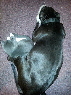 Here I am with my new friend Chyna. She looked scary at first, but she just sniffed me and then let me snuggle with her. My new family calls me Arwen, it’s a pretty name. I get lots of lap time when I want it, so that’s good. Hope the rest of my family found a good home too!
