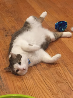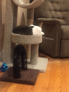 It has been 3 days since Forest was adopted and he is such a sweet boy! We were all a little unsure of his temperament when we were looking at him but he has made humongous strides in just this short period of time. The first two hours we had him, he staked out a spot under our oil tank and hid. We managed to coax him out and show him his litter box, food and get some belly rubs in! We were sure it was going to take longer for him to get comfortable with us but he slept in our bed that same evening! He has made amazing improvements already and loves lying in his cat tower and playing with his new toys and