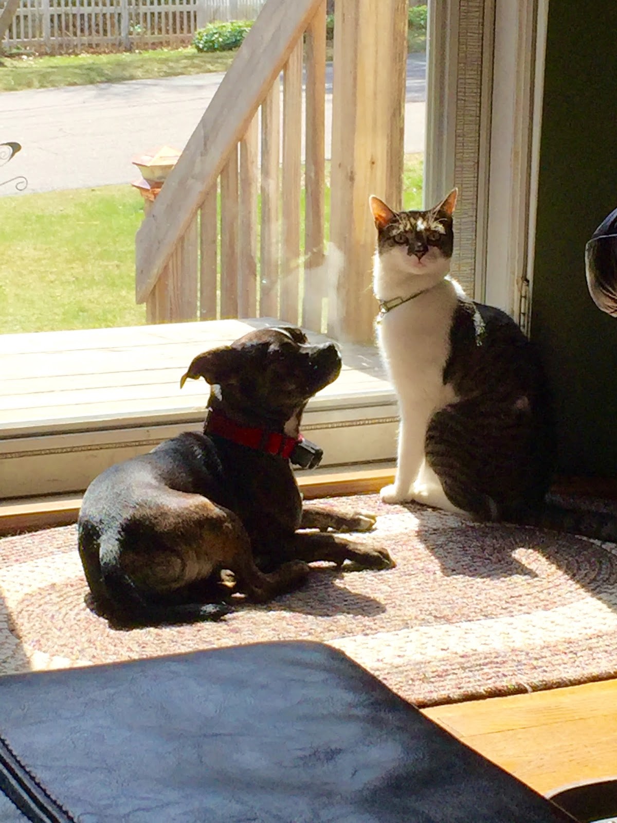 Watson is doing EXCELLENT! He basically rules the house, always putting his two puppy siblings in their place if they get out of hand! Recently we adopted a 8 week old calico kitten and she thinks Watson is the best big brother! Watson has accepted her into our home well, today we caught the two snuggling and he was washing her! He truly is a special boy, and while not overly affectionate, he is perfect for us! And he has done a fine job of mousing, he got 7 in a two week period!